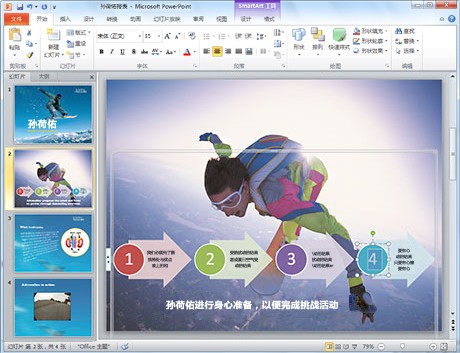 设计出色的教学演示文稿 •使用 PowerPoint 2010,可以在课堂演示文稿中添加引人注目的视觉效果和大量媒体,包括视频以及音频和照片。 •使用允许您对图像进行裁剪、着色和添加纹理的照片编辑功能,使幻灯片更让人难忘。 •使用视频编辑器,在演示文稿中直接插入和编辑视频并添加令人叫绝的创意效果。 •使用广播质量的幻灯片切换,添加专业润色。 •使用广播幻灯片,与同学联机共享演示文稿。*