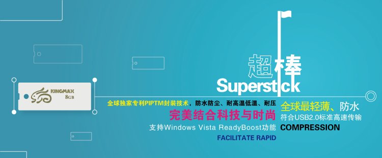 产品介绍: 拥有超棒,事业生活超棒! 产品特点:● 采用独家专利PIP封装技术● 全球独家拥有防水功能产品● 搭配饰品般精巧的造型● 科技与时尚的完美融合 产品规格: ● 符合USB 2.0标准● 尺寸:38.3mm×12.4mm×2.2mm● 容量:2GB~32GB ● 高速传输● 支持微软Windows7 Vista“ReadyBoost”技术 品牌介绍: Kingmax集团于1989年成立于台湾,Kingmax集团是全球模块制造厂商中,第一家具备自有的封装及测试设备。集团旗下的Kingpak Technology Inc.拥有一流的设备以及顶尖的技术人员,掌握了完整的核心技术,将所有生产流程垂直整合,从上游的晶圆切割、封装、测试、到产品研发、设计等所有流程都包含在内。